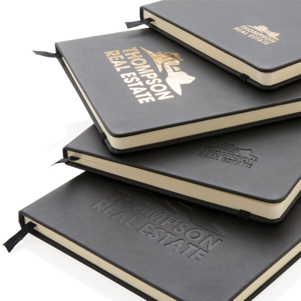 A5 hardcover gelinieerd PU notitieboek met elastieken band sluiting en zwarte bladwijzer. 144 pagina’s van 70g/m2.