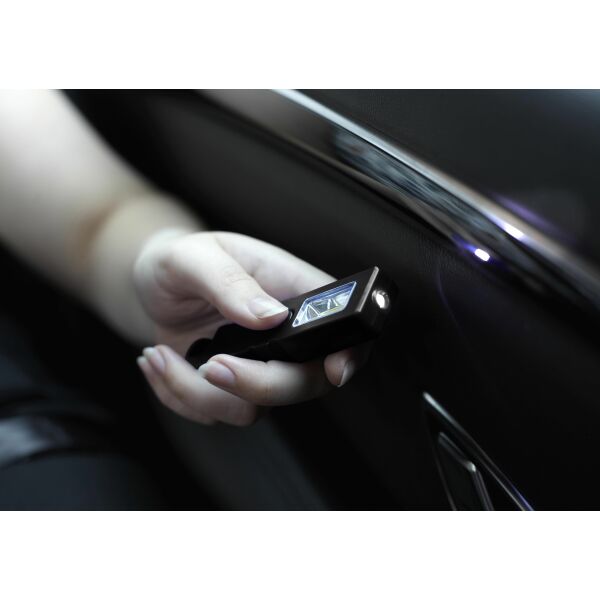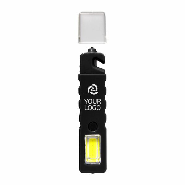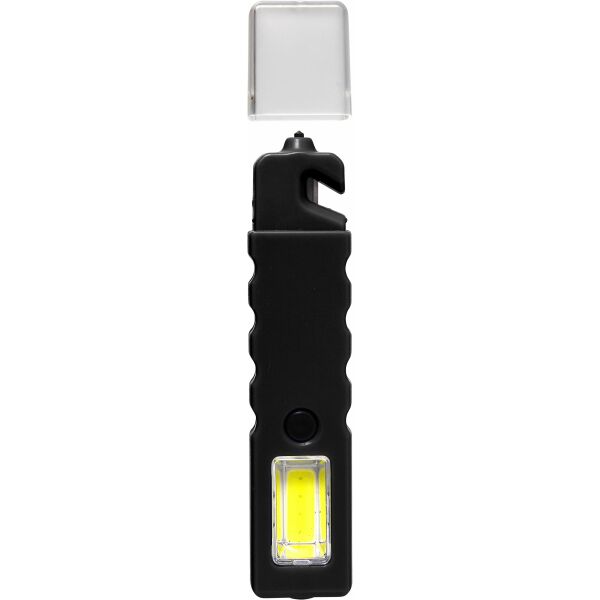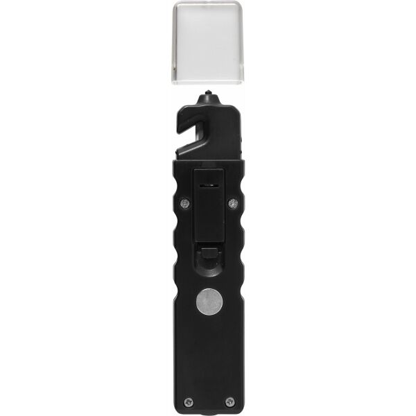 Multifunctionele veiligheidstool. Met COB lamp met vier LEDs (inclusief knipper-functie), een veiligheidshamer voor het breken van de autoruit en een gordelsnijder. Inclusief transparante dop. De tool heeft een magneet en 4 knoopcel batterijen.
