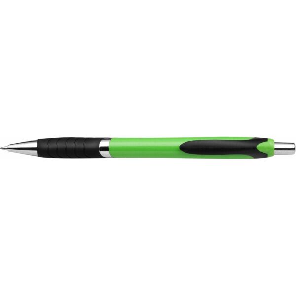 Kunststof balpen, blauwschrijvend, met verchroomde accenten, zwart kunststof grip en clip.