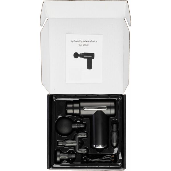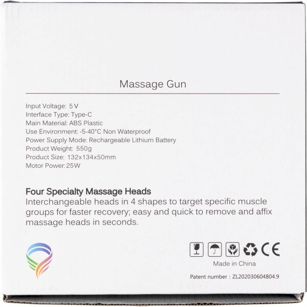 ABS massagepistool met borstelloze motor (snelheid 1.800 - 3.200 tpm) en 1.200 mAh oplaadbare batterij. 5V invoer en 6 intensiteitsniveaus om de spieren te masseren. Individueel verpakt per stuk in geschenkdoos, inclusief 4 massagekoppen.