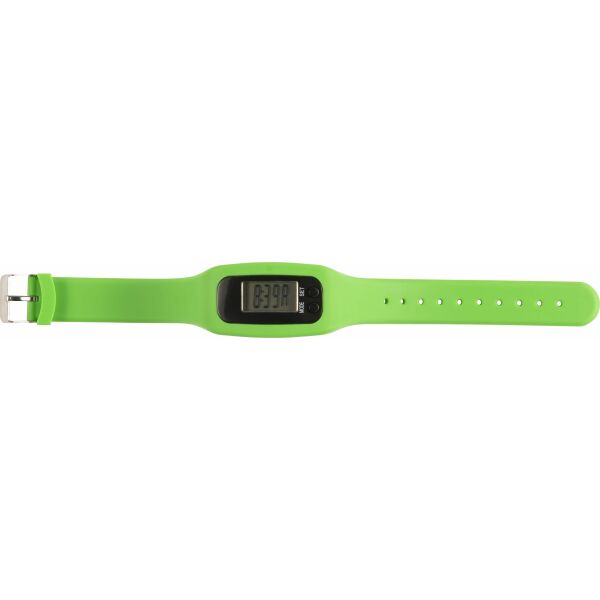 Stappenteller met siliconen armband. Telt stappen (tot 99.999), calorieën en afgelegde mijlen/kilometers. Inclusief batterijen. 1.5 Volt.
