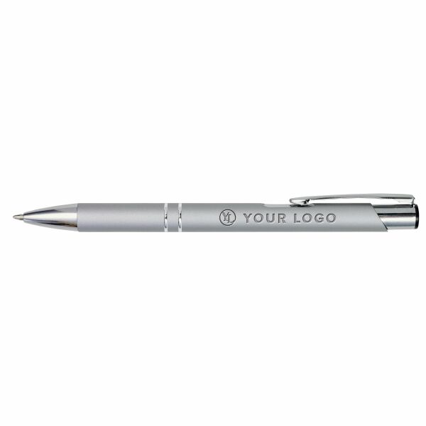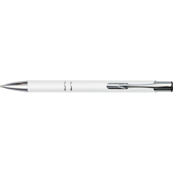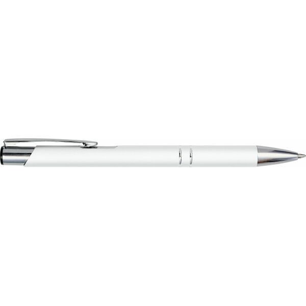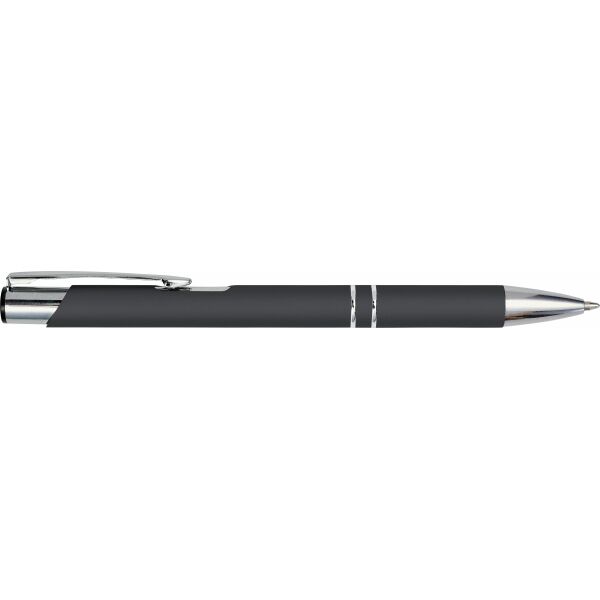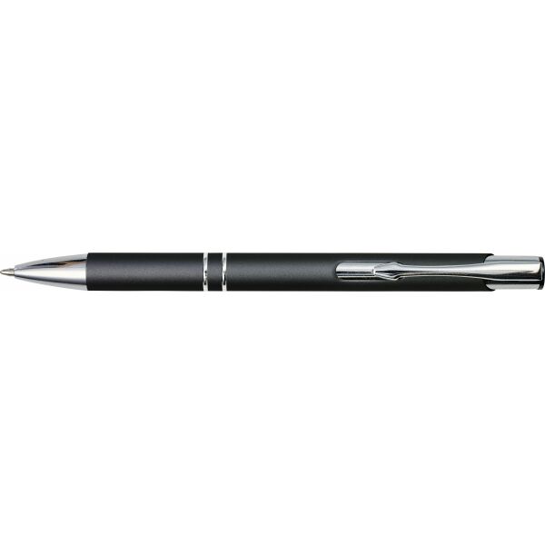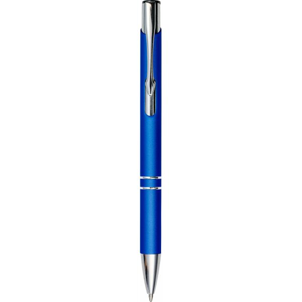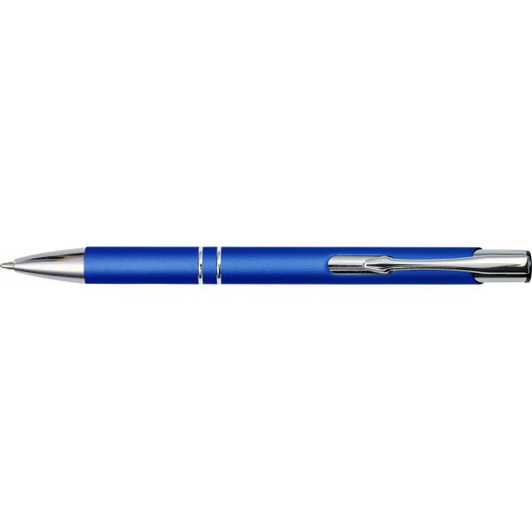 Metalen balpen, blauwschrijvend, met rubber en twee zilverkleurige ringen, clip en tip.