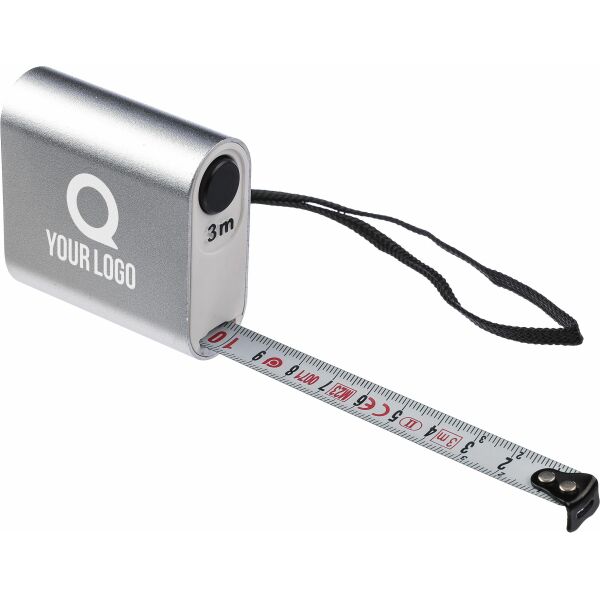 Aluminium meetlint. 3 meter lang. Met drukknop en bedrukte centimeters, inclusief polskoord. Per stuk verpakt in een bruin kartonnen doos.