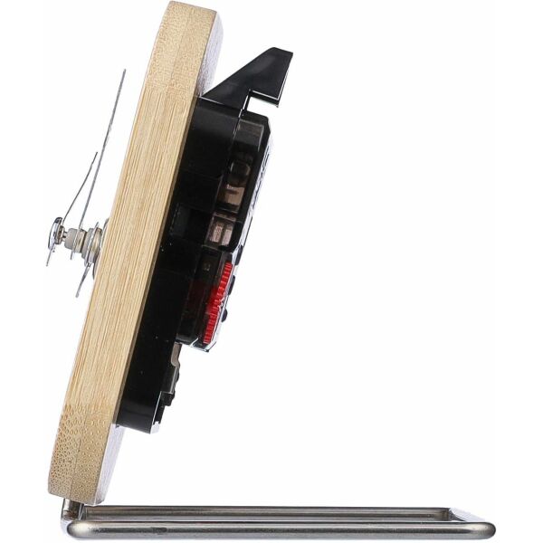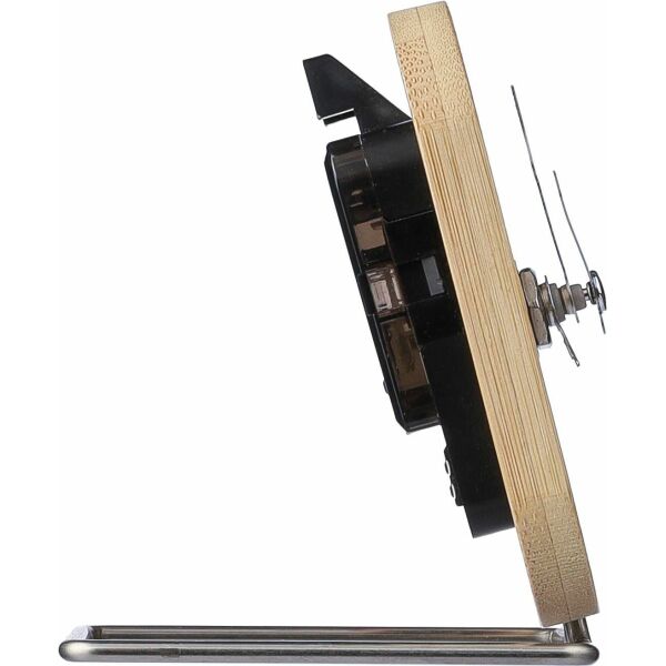 Bamboe klok met zilveren wijzers en standaard. Inclusief batterij. Per stuk verpakt in een bruine kartonnen doos.